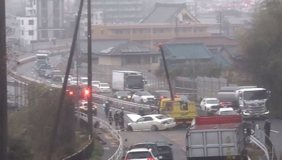 「1号線の『采女の打(パチンコ店付近か)』ちっぱなしの近く、完全に通行止めしとる。単独事故っぽいけど」