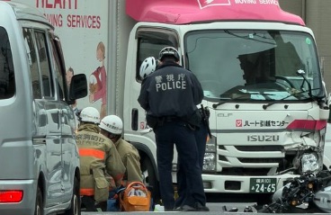 現場は引越センターのトラックとバイクが衝突しており、警察や消防による対応が行われています。
