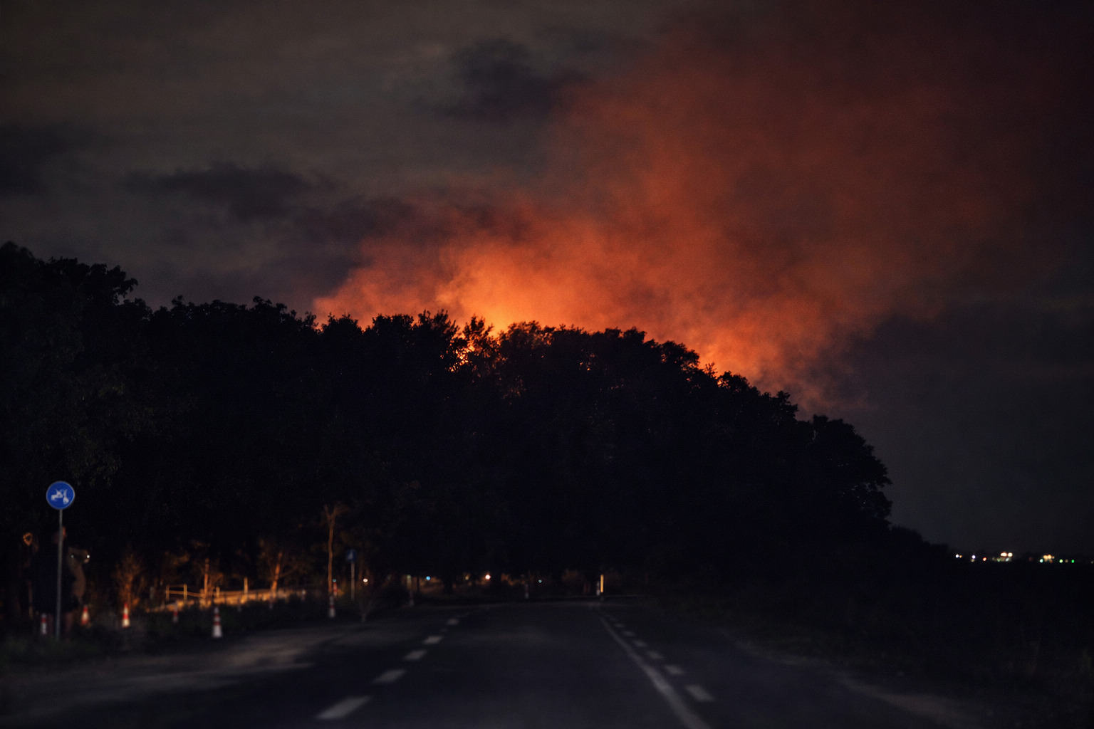 投稿された画像からは、木々の向こう側でオレンジ色の炎が大きく上がっている様子が確認できます。夜間ということもあり、火災の明るさが際立っており、現場の緊迫感が伝わってきます。