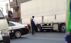 現場は「日曹橋」から「新木場」方面へ向かう道路で、大型トラックを含む車両が関与していると見られ、警察官による誘導が行われていますが、車列は全く進まない状況となっています。