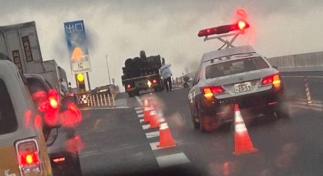 投稿された画像からは、雨模様の中、パトカーが車線を規制し、積み荷を積んだトラックが停車している様子が確認できます。片側1車線の区間や合流部での事故のため、完全に流れがストップしている模様です。