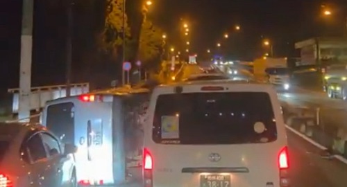 現場を走行したドライバーからの報告では、交差点付近で白いバンが完全に横向きに倒れており、道路を塞いでいる様子が確認されています。