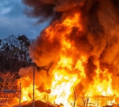 - 状況:建物から激しい炎が上がり、山火事のように見えるほどの黒煙が立ち上っています。