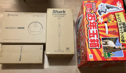 「ヨドバシ福袋、掃除機セットが大当たり!Sharkのスティックとハンディ、さらにECOVACSのロボット掃除機まで入って4.5万は安すぎる。今年の運を使い果たしたかも…!」