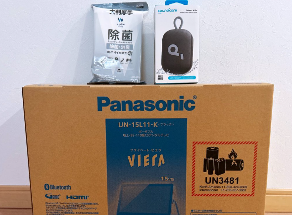 結論から言うと、中身はPanasonic プライベート・ビエラ UN-15L11K(15V型防水ポータブルテレビ) + Anker Soundcore Select 4 Go(Bluetoothスピーカー) + 除菌ティッシュという構成。テレビ本体だけで定価5〜6万円相当のモデルが入っており、実質大当たりとの声が多数!「ちょっと古い機種だけど満足」「モニターでかくて笑った」というポジティブ反応が目立ちます。