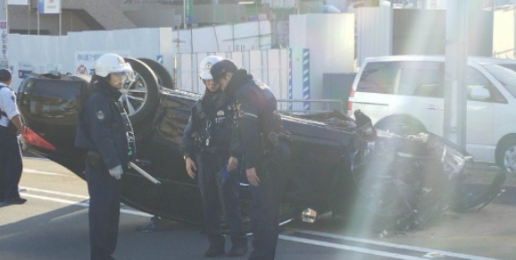 - 状況:黒色の乗用車1台が車道中央付近で裏返しに横転