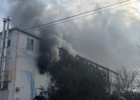 現場画像からは、白い壁面の比較的大きな建物(工場や倉庫と思われる施設)の窓や屋根付近から、大量の煙が出ていることが確認できます。消防隊による消火活動が行われているものと見られます。