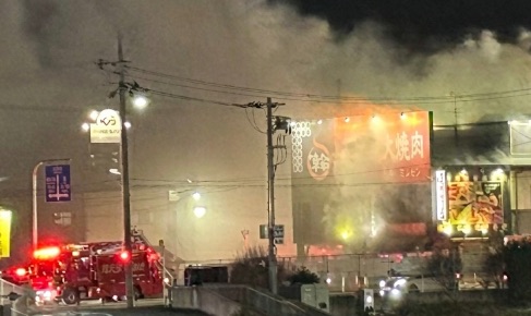 投稿された画像からは、店舗の看板「本格炭火焼肉 輪」の背後や内部から赤い炎が見え、夜空に白煙が立ち上っている様子が分かります。周辺にはサイレン音が鳴り響いているとのことです。