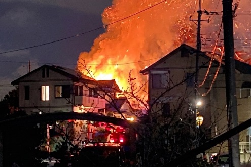 目撃証言によると、夜空が赤く染まるほどの大きな炎と煙が確認されています。現場付近では消防車や救急車のサイレンが鳴り響いており、騒然とした雰囲気となっています。