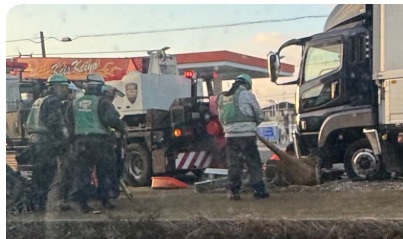 - 状況:大型トラック(トレーラー)が中央分離帯に乗り上げている状態