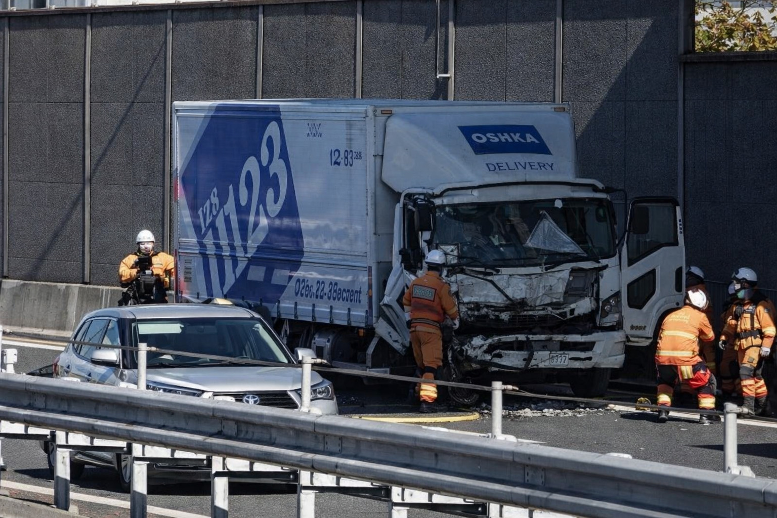 引越関連の大型トラックと乗用車が絡む衝突事故とみられ、トラックの前方部分が大きく破損し、中央分離帯付近に停車している様子が確認されています。現在、消防や警察によるレスキュー活動と現場検証が行われています。