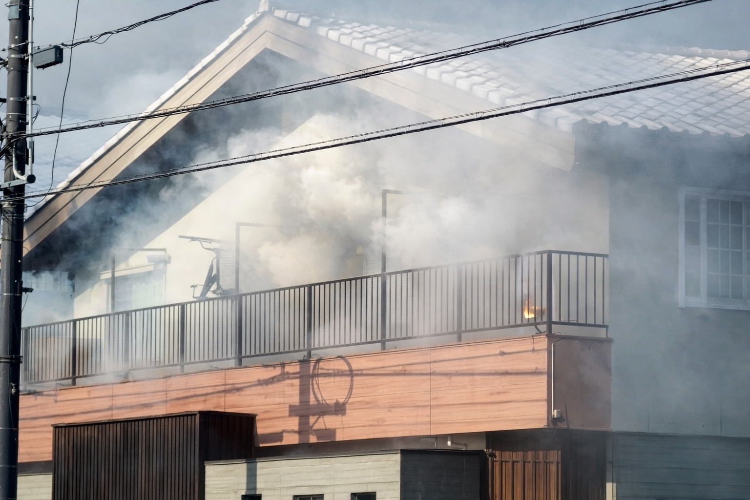 ・「家の近くで火事…大丈夫かな」(住宅の屋根越しに煙)
