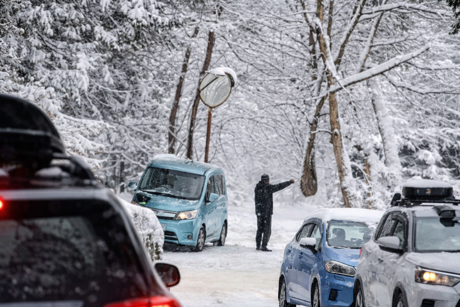 - スタッドレスタイヤ・チェーン必須:山間部は完全な雪道です。装備不十分な車は引き返してください。