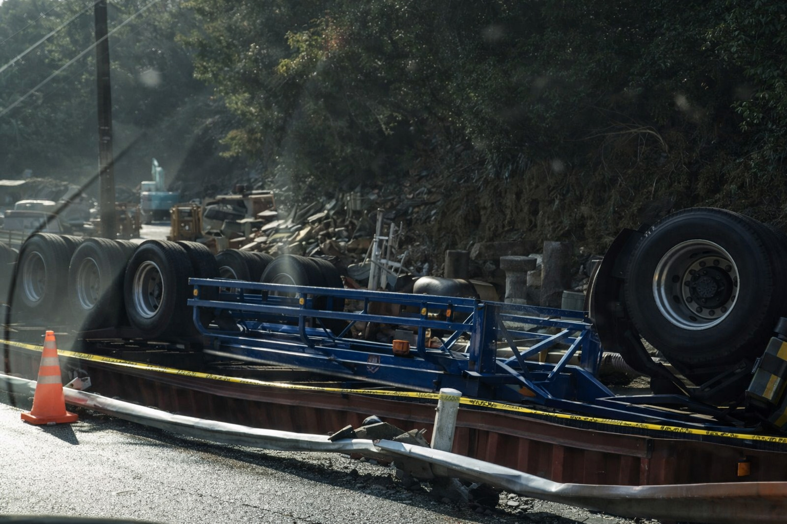 • 状況:コンテナを積載した大型トレーラーがカーブを曲がりきれず横転し、道路脇(川側)へ転落。