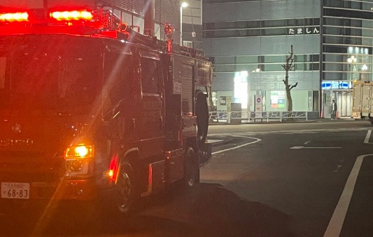 - 消防車等の緊急車両が複数台到着し、停車中。