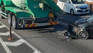 - 状況:コンクリートミキサー車と軽乗用車の衝突。軽自動車の前方部分が大破し、車線の一部を塞いでいます。