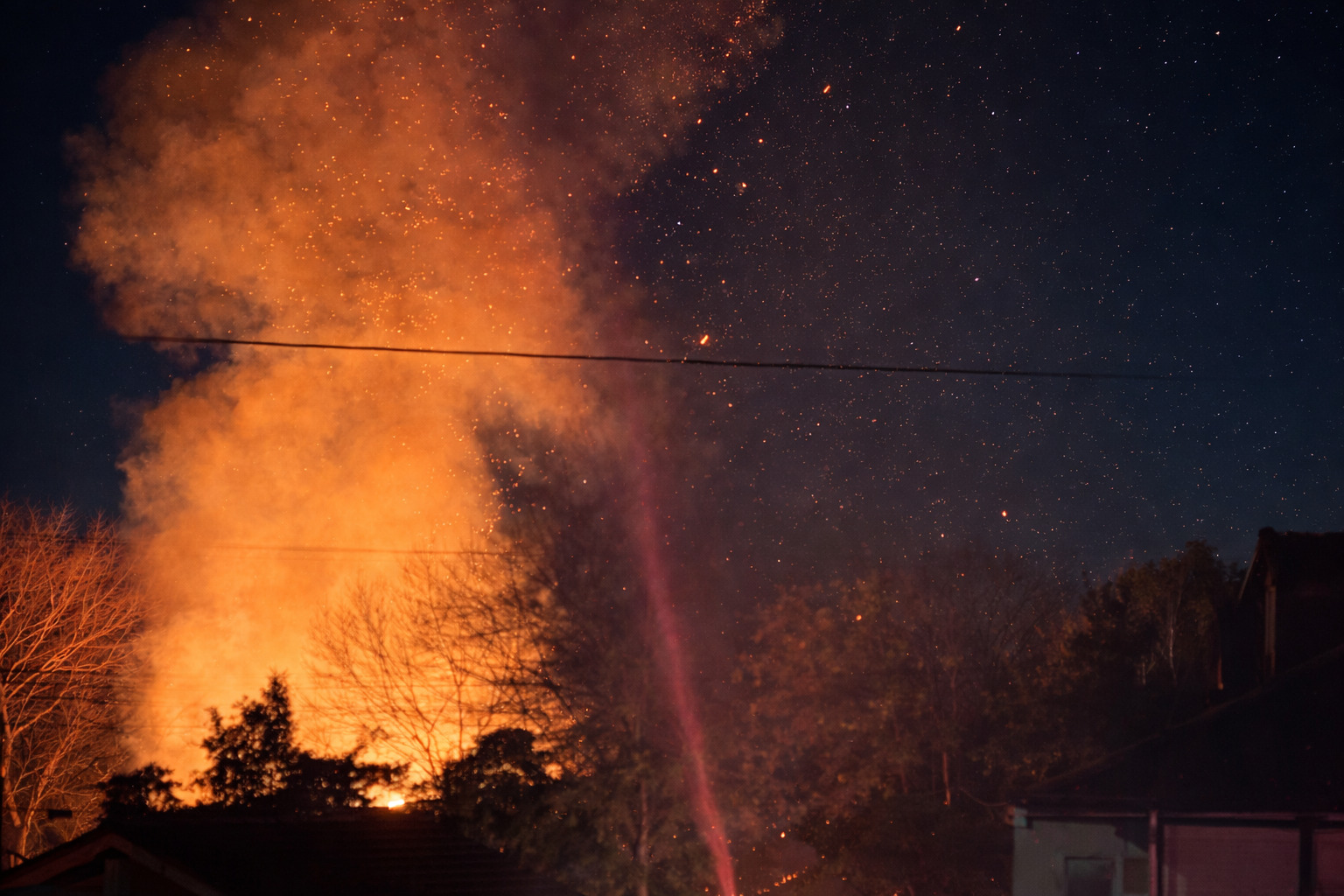 投稿された画像からは、夜空を焦がすほどの大きな炎が確認できます。風向きによっては延焼の危険性もあったようですが、消火活動が行われている模様です。