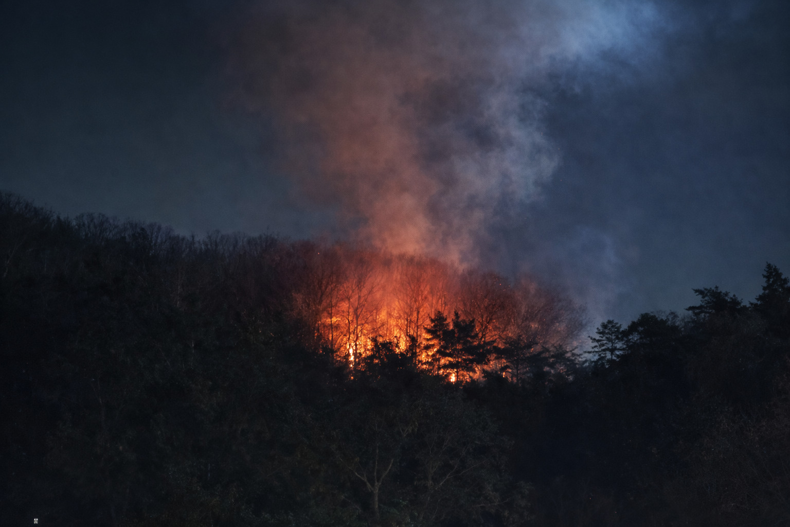 青梅で枯草火災かな?赤い炎が見える。乾燥してるから怖い。