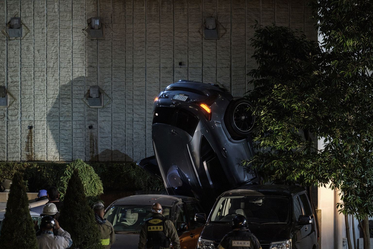 - 状況:乗用車が道路脇のフェンスを突破し、数メートル下の敷地へ転落。車体は前のめりの状態で建物と壁の間に挟まり、ほぼ垂直(逆さま)の状態で停止しています。