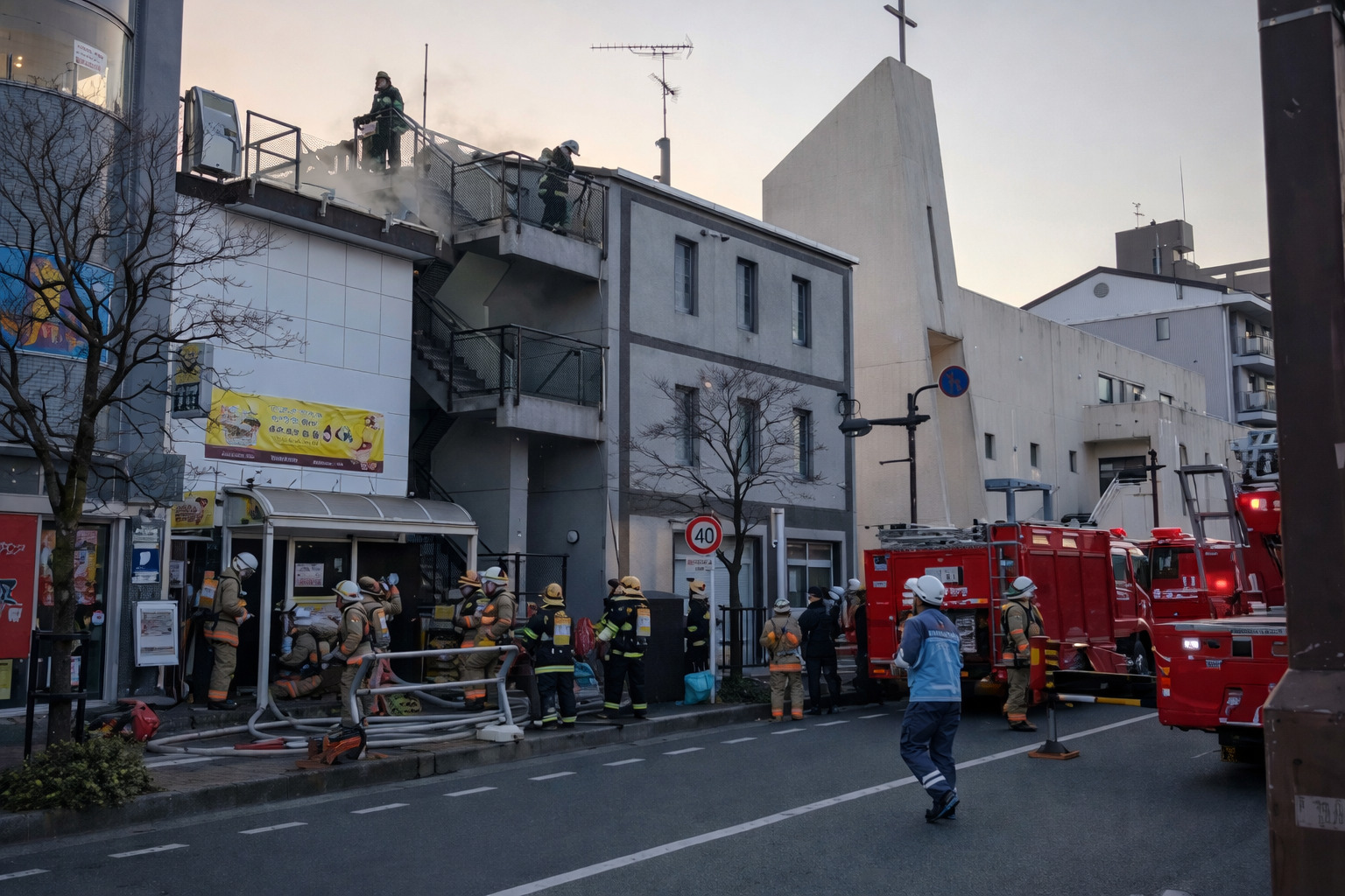 - 状況:建物火災、消防隊による活動中