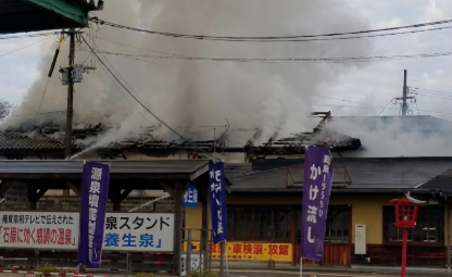 現場からの情報では、「三友公民館が全焼」「ならのさこ温泉の屋根が落ちている」といった報告が上がっています。画像では、温泉施設ののぼり(「源泉かけ流し」など)がある建物の屋根から白煙および黒煙が激しく立ち上っている様子が確認できます。