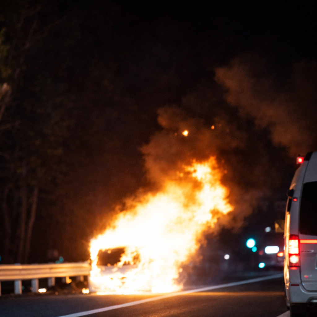 画像等の情報によると、軽トラックとみられる車両全体が炎に包まれており、激しい黒煙が上がっている様子が確認できます。「車が盛大に燃えている」「熱気がすごかった」との報告があり、消防隊による消火活動が行われています。
