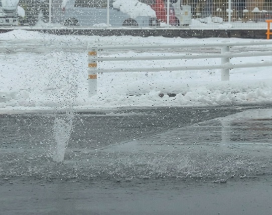現地からの報告によると、道路のアスファルト付近から水が噴水のように高く吹き上がっており、積雪も相まって路面状況が悪化しています。付近を通行される方は十分にご注意ください。