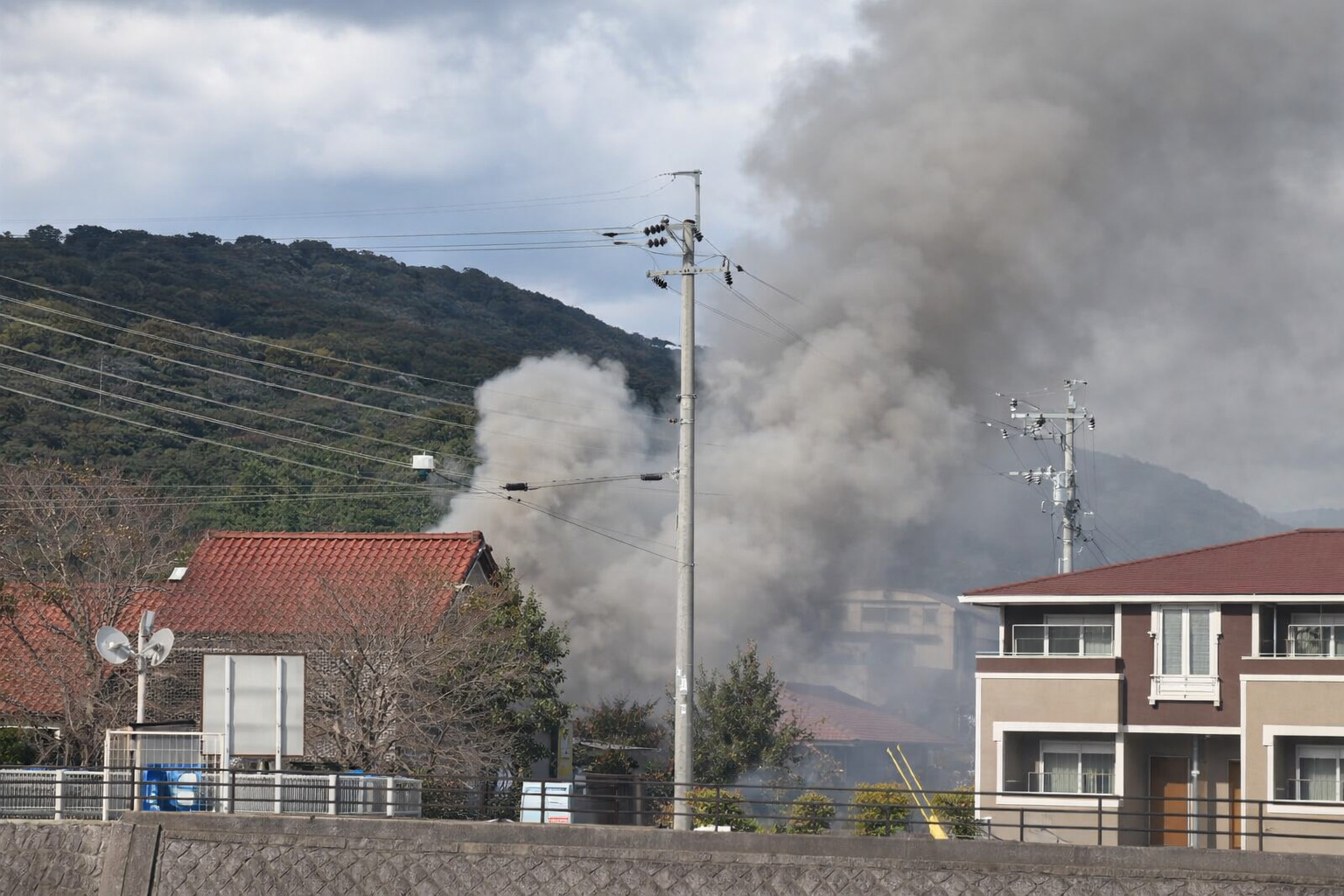 現場からの報告によると、住宅地の一角から激しい炎と煙が上がっている様子が確認されています。画像情報からは、山あいの住宅密集地であり、電線付近まで煙が充満していることが分かります。