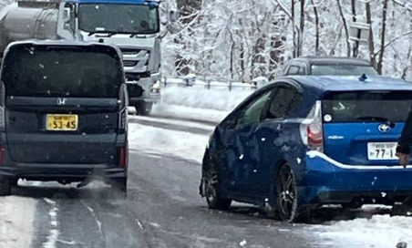 現場画像からは、青色の乗用車のフロント部分が大破し、道路脇に停車している様子が確認できます。また、路面は圧雪・凍結状態(アイスバーン)である可能性が高く、視界やスリップに注意が必要な状況です。
