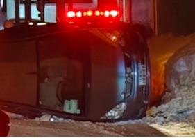 現場では車両が横向きに倒れており、道を塞いでいる状況が確認されています。警察やレッカーによる処理が行われていますが、通行の際は注意が必要です。