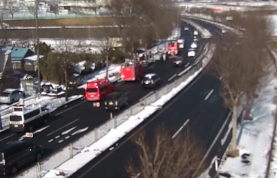 ライブカメラの映像では、緊急車両が複数台停車し、通行可能な車線が制限されている様子が確認できます。この影響により、後方で渋滞が発生する可能性があります。