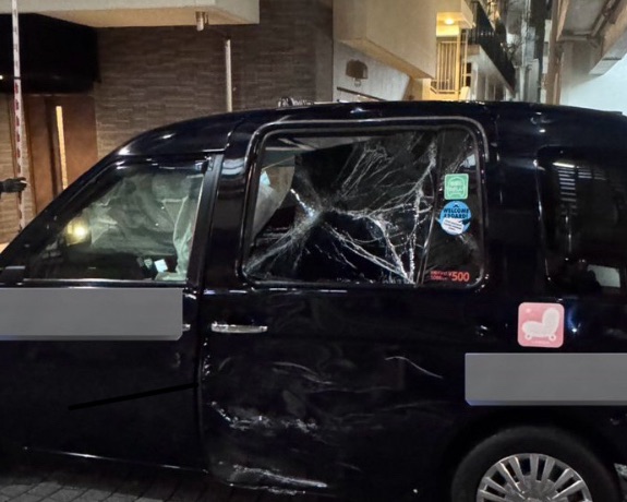 - タクシーの左側後部スライドドア付近が大きく凹み、窓ガラスが粉々に割れている。