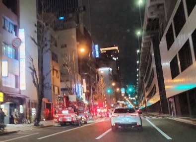 「本町の路地で後ろから消防車が通る声。20m先くらいで瞬く間に消防車が5台。ビルから出てくる人もいたが、結局火事ではなかったっぽい」