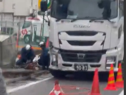 - 状況:大型トラック(ISUZU GIGA)の前方破損、歩道付近への乗り上げ等の報告あり