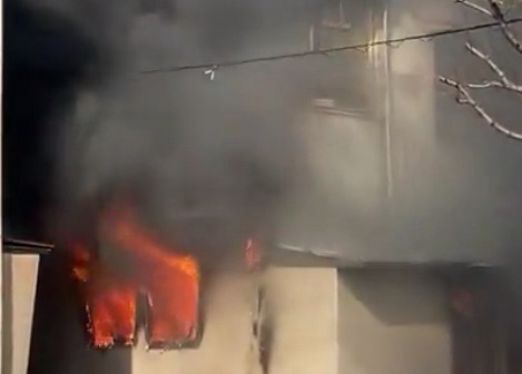 • 建物から激しい炎と黒煙が上がっている。