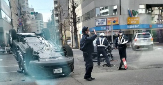 画像からは、交差点の真ん中で車両が裏返しになっており、発煙筒が焚かれている様子が確認できます。