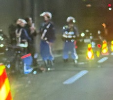 警察車両および警察官が現場に到着しており、発炎筒やパイロンを用いた交通整理が行われています。未明の時間帯ですが、通行時は追突等に十分ご注意ください。
