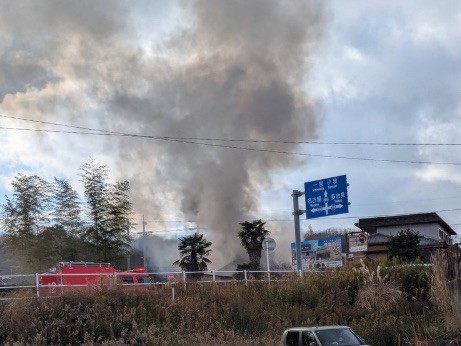 SNSや現地の方の情報によると、消防車が到着し消火活動にあたっていますが、周囲には煙による視界不良や異臭が広がっています。