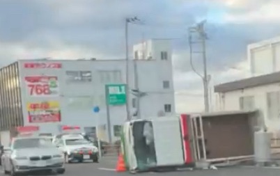 現場ではトラックが道路を塞ぐ形で横転しており、警察官による規制線が張られています。