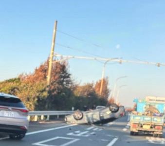 - 状況:乗用車の単独横転事故。左車線が規制されています。