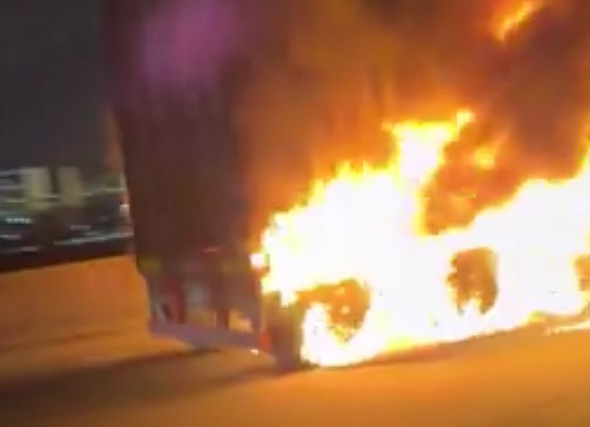 SNS上の投稿や目撃情報によると、大型とみられる車両から激しく炎が上がっている様子が確認されており、消防などによる活動が行われている模様です。