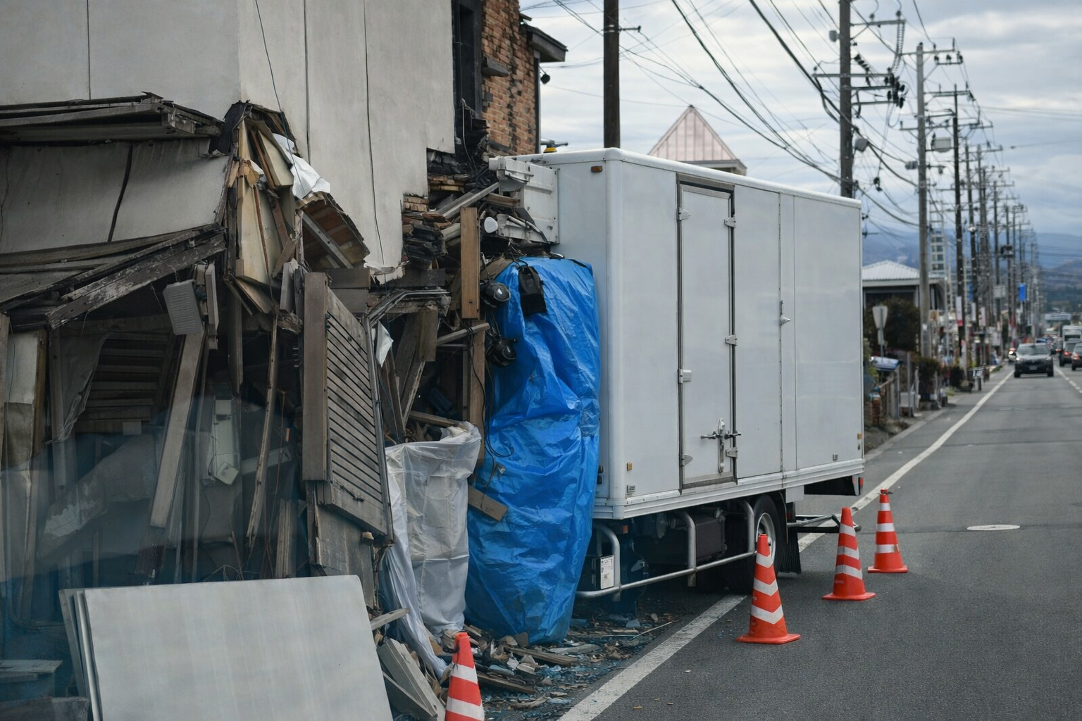 - 状況:白い箱型トラックが建物側面に衝突し停止