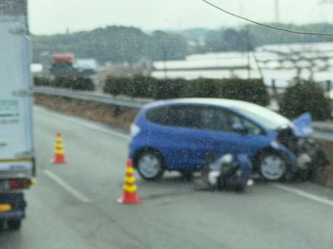 • 状況:青色の乗用車が路肩・法面に衝突して大破。三角コーン(規制機材)が設置され、車線規制が行われている模様です。