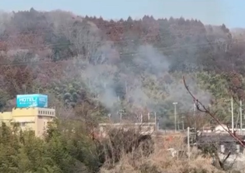 画像を確認すると、建物裏手の斜面または付近の構造物から白い煙が立ち上っているのがわかります。乾燥した天候の影響もあり、火の回りが早くなっている可能性があるため注意が必要です。
