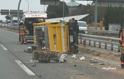 • 状況:作業用車両(黄色いトラック)の横転、道路上への荷物飛散