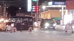 - 被害状況:黒の軽ワンボックス車がフロント部分を激しく大破。道路上に破片が散乱。