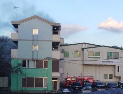 投稿された画像からは、青と緑の特徴的な配色の4階建てマンションおよび、隣接する事業所と思われる建物の付近に消防隊が展開している様子が伺えます。