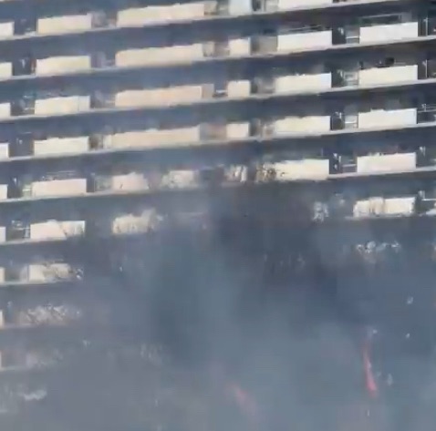 現場周辺の様子を捉えた画像では、マンションの下層部から上層階に向けて白い煙がもうもうと立ち込めており、周囲の視界が遮られるほどの状態になっています。現時点で建物の延焼やけが人の詳細な情報は入っていませんが、非常に危険な状況です。