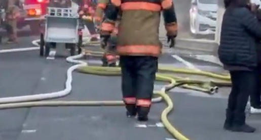- 複数の消防隊員が懸命に消火活動にあたっている