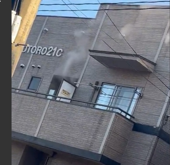 画像から確認できる現場の状況として、「OTORO21C」という名称が記されたマンション・アパートと見られる建物の2階部分から出火している模様です。出入り口付近の扉が開いており、そこから外に向かって白煙が噴出している様子が確認できます。